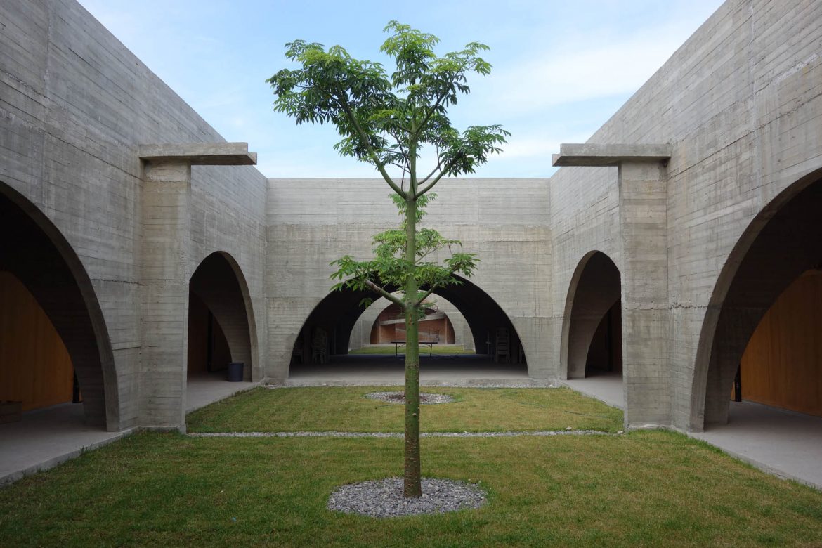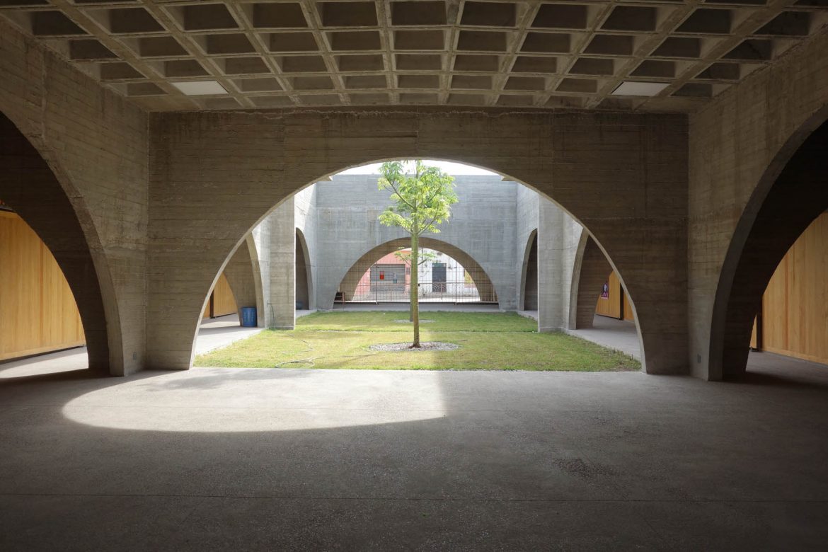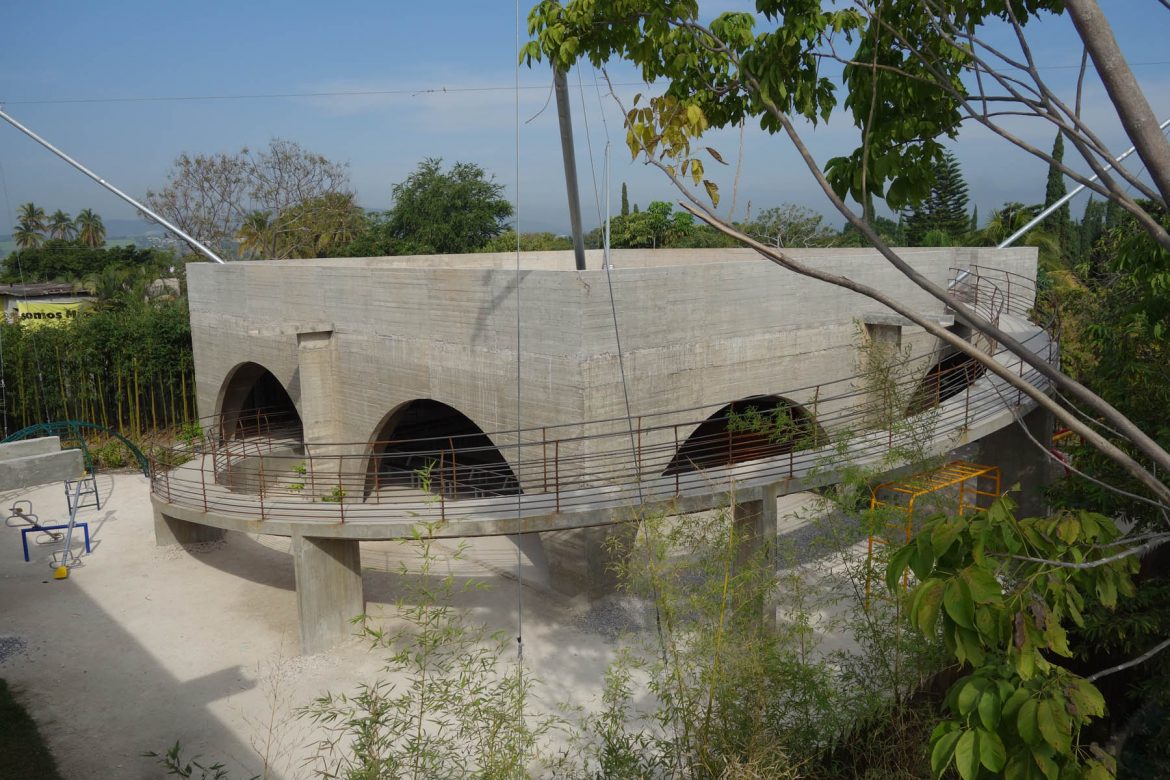 Die dreizehn Klassenzimmer und der Bürobereich befinden sich im Hauptvolumen. Ein zweites Volumen mit einer langen Rampe, die sich um das Gebäude windet und es visuell prägt, bietet Raum für die Schulkantine. Die fliessende Zirkulation zwischen den Räumen und den grosszügigen Dachflächen sowie der unkomplizierte Übergang zwischen Innen- und Aussenräumen wird durch das stets warme Klima in Jojutla ermöglicht.