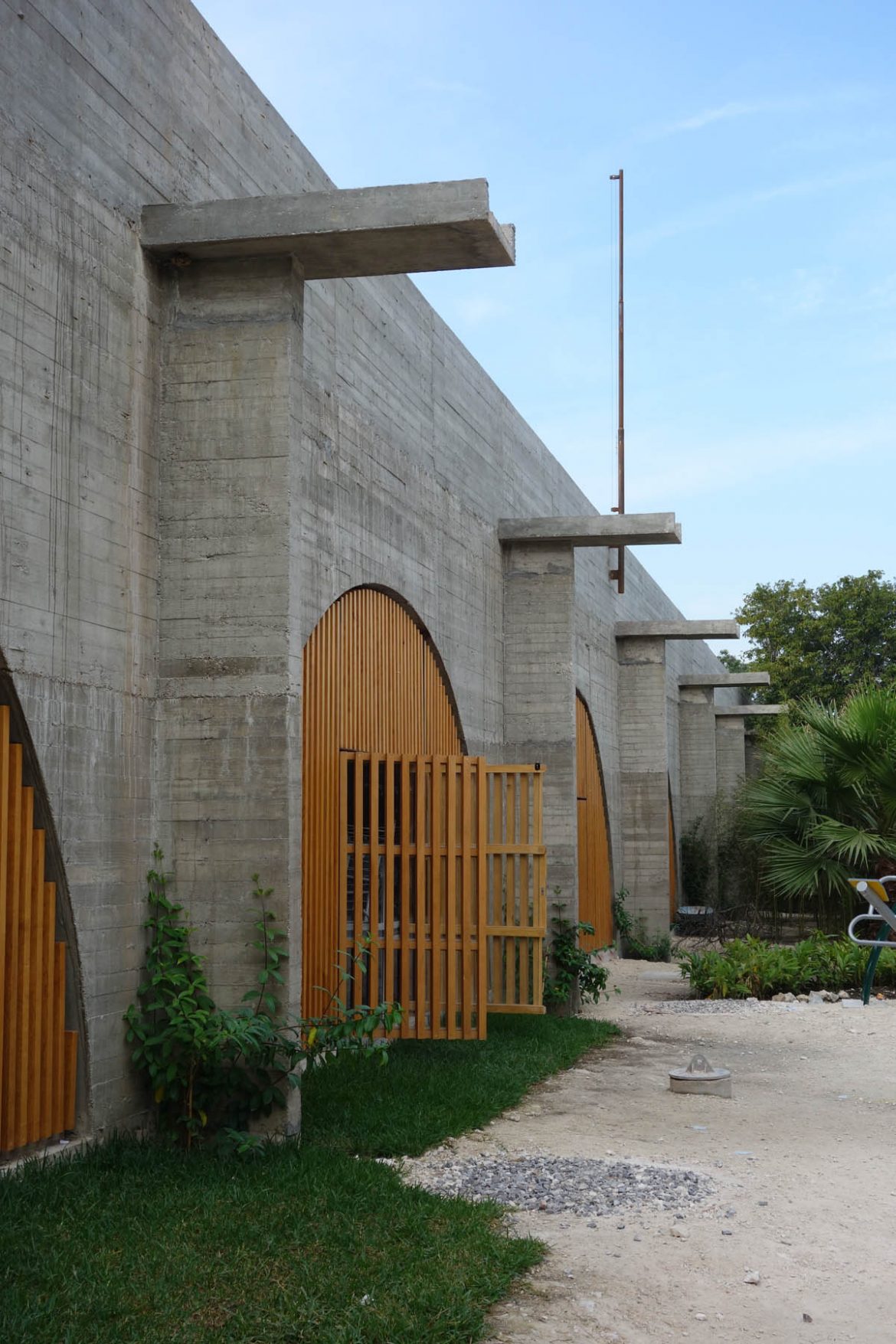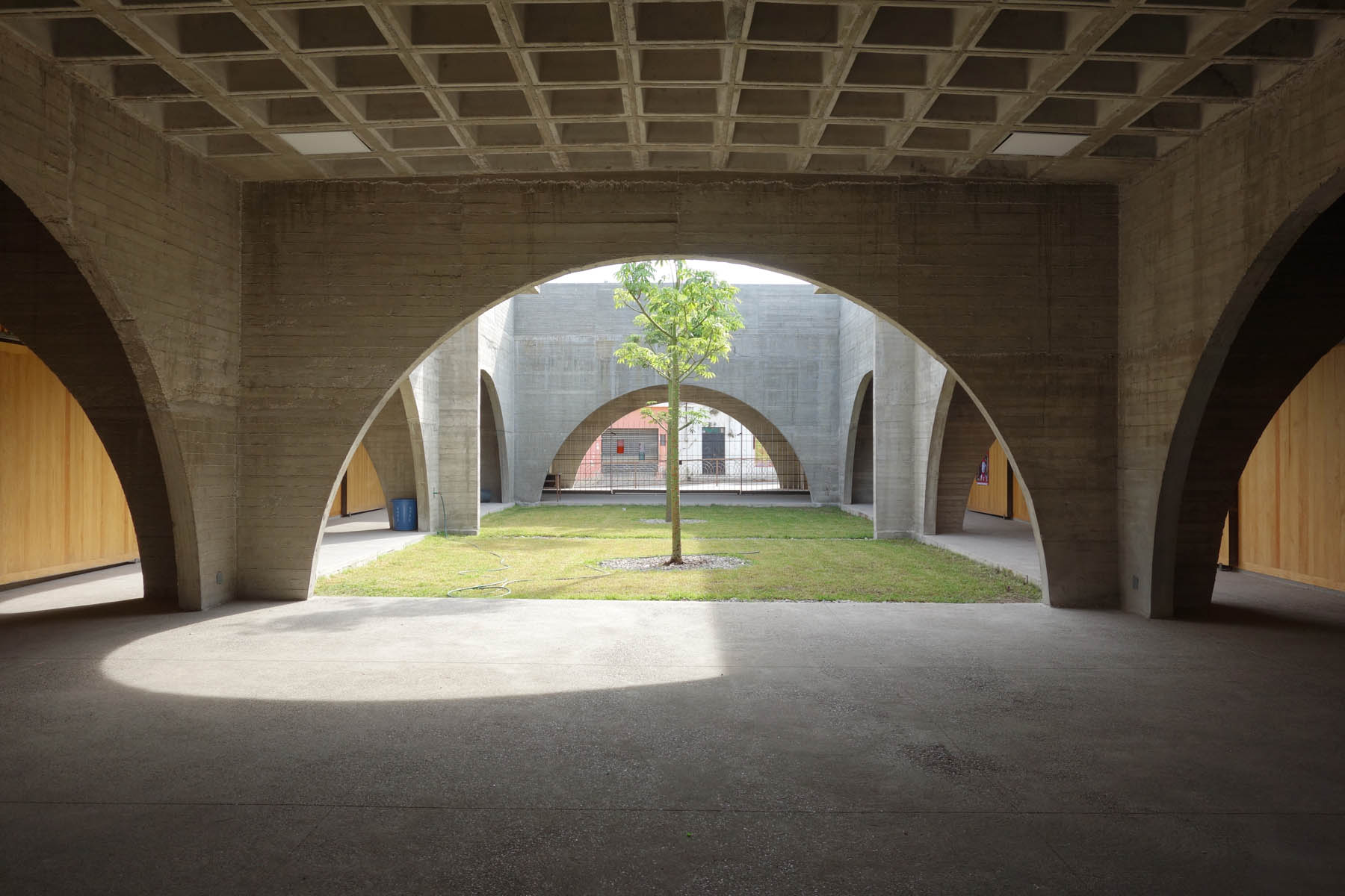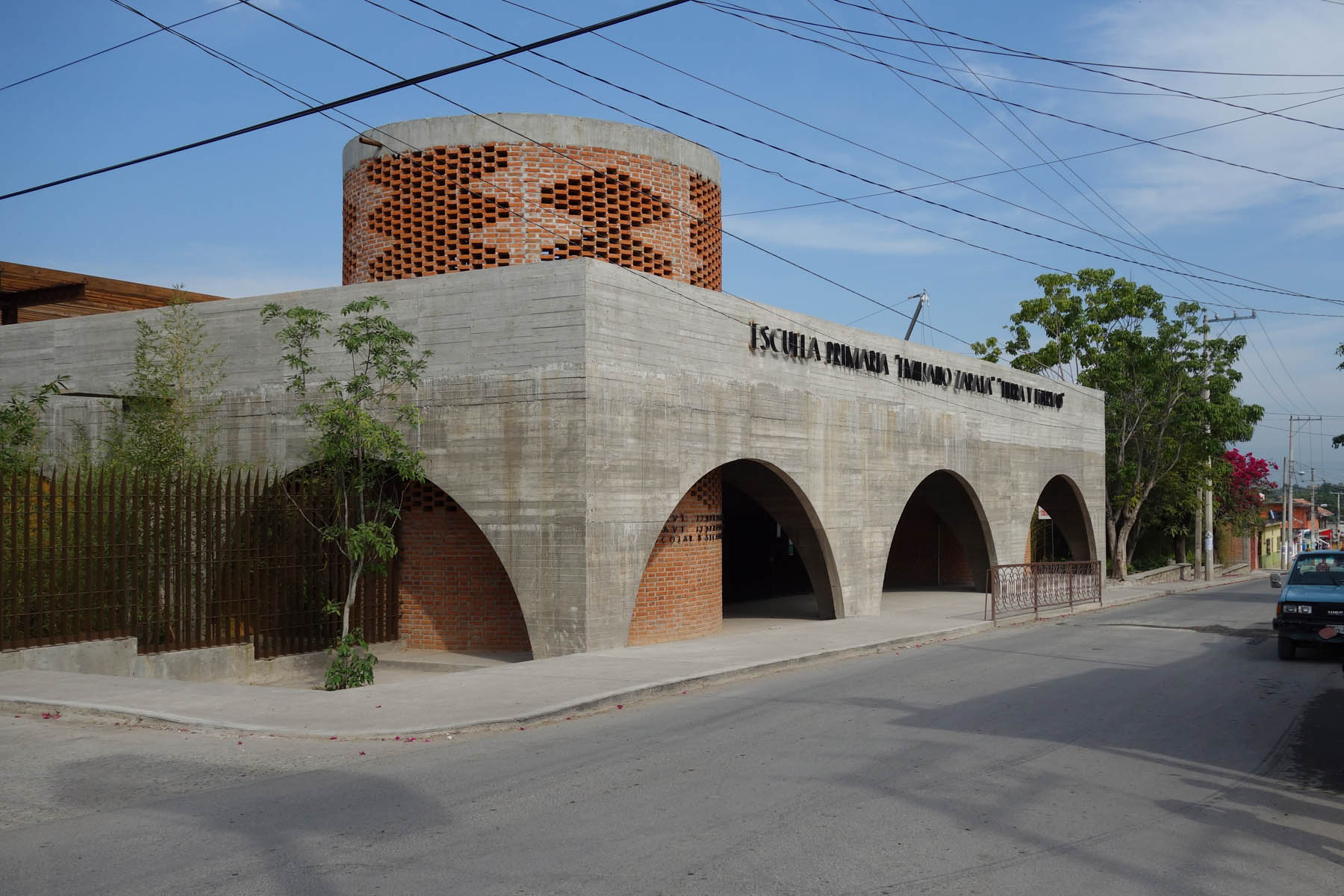 Der Ausdruck des Schulgebäudes gleicht dem der anderen in Jojutla fertiggestellten öffentlichen Gebäude: er kommuniziert Stärke und eine hohe Erdbebensicherheit. Massive Kassettendecken bilden zusammen mit den grossen Betonbögen die Tragstruktur. Kontraste zur Massivität werden erzeugt durch grosse Holztüren und spiralförmige Elemente aus roten Ziegeln.