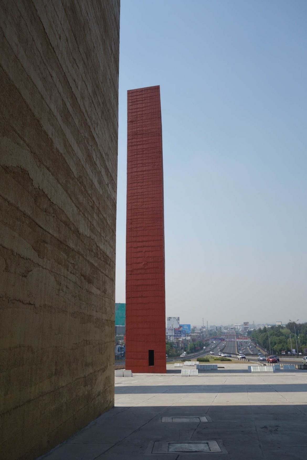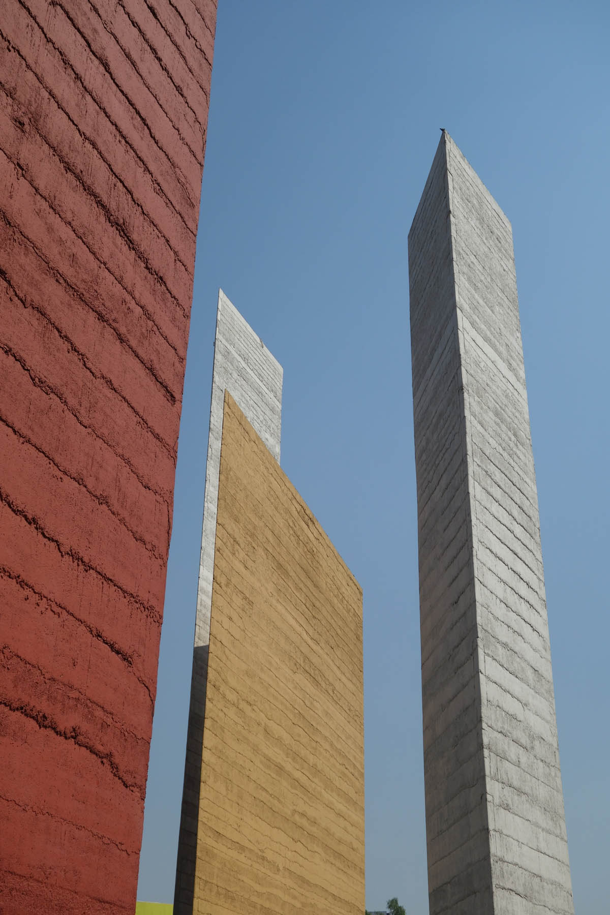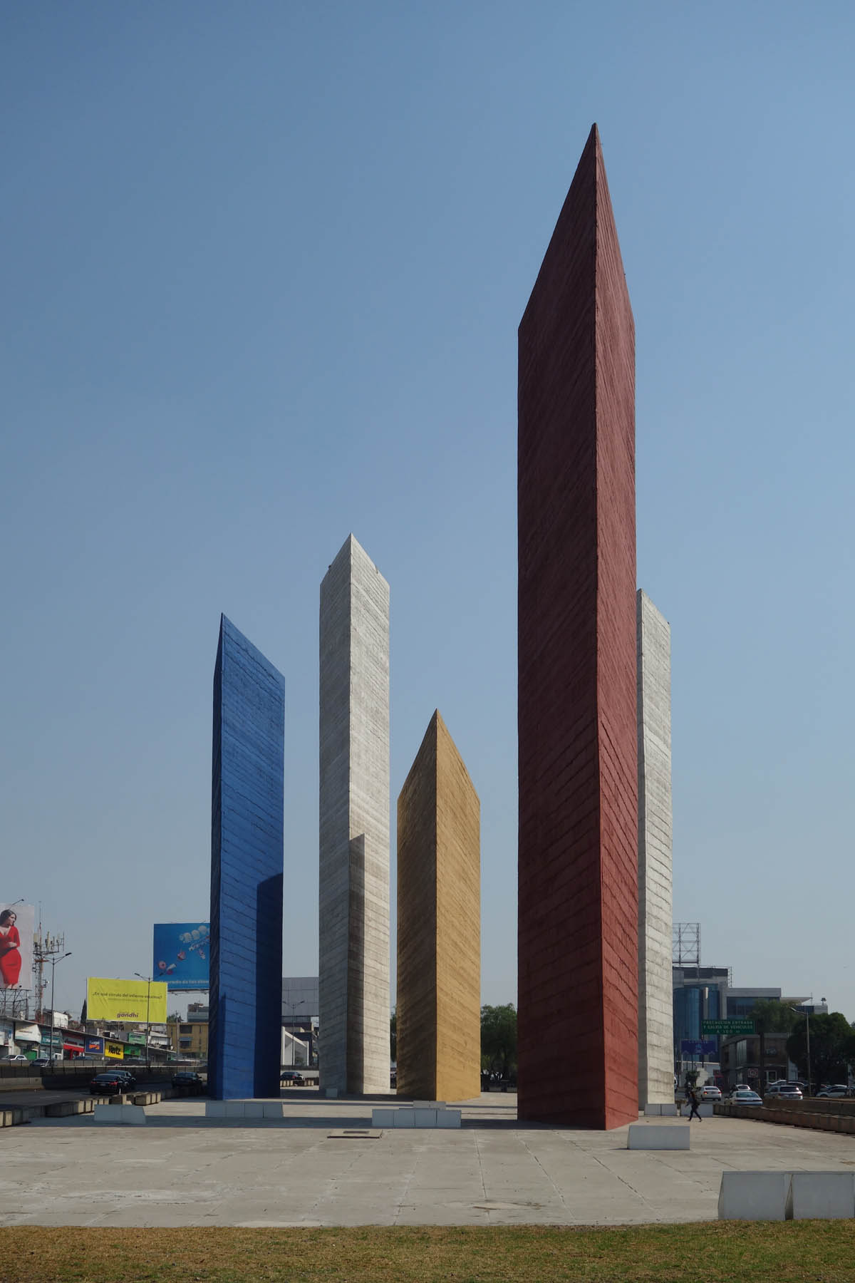 They are standing in the middle of a kind of immense traffic island: the guards of North Mexico City. Five towers in the colors yellow, white, blue and red seem to soar on an elevation and are passed by hundreds of cars every day. The triangular, urban sculptures point with their head south towards the city center of Mexico City. The strong colors are recognizable from a great distance and represent an important point of orientation in the region. Depending on the viewing angle, the towers, which are between thirty and fifty meters high, change their appearance. Sometimes they look narrow and high, sometimes deep and wide. Close up, the horizontal traces of the formwork stages enhance the visual impression of the height.