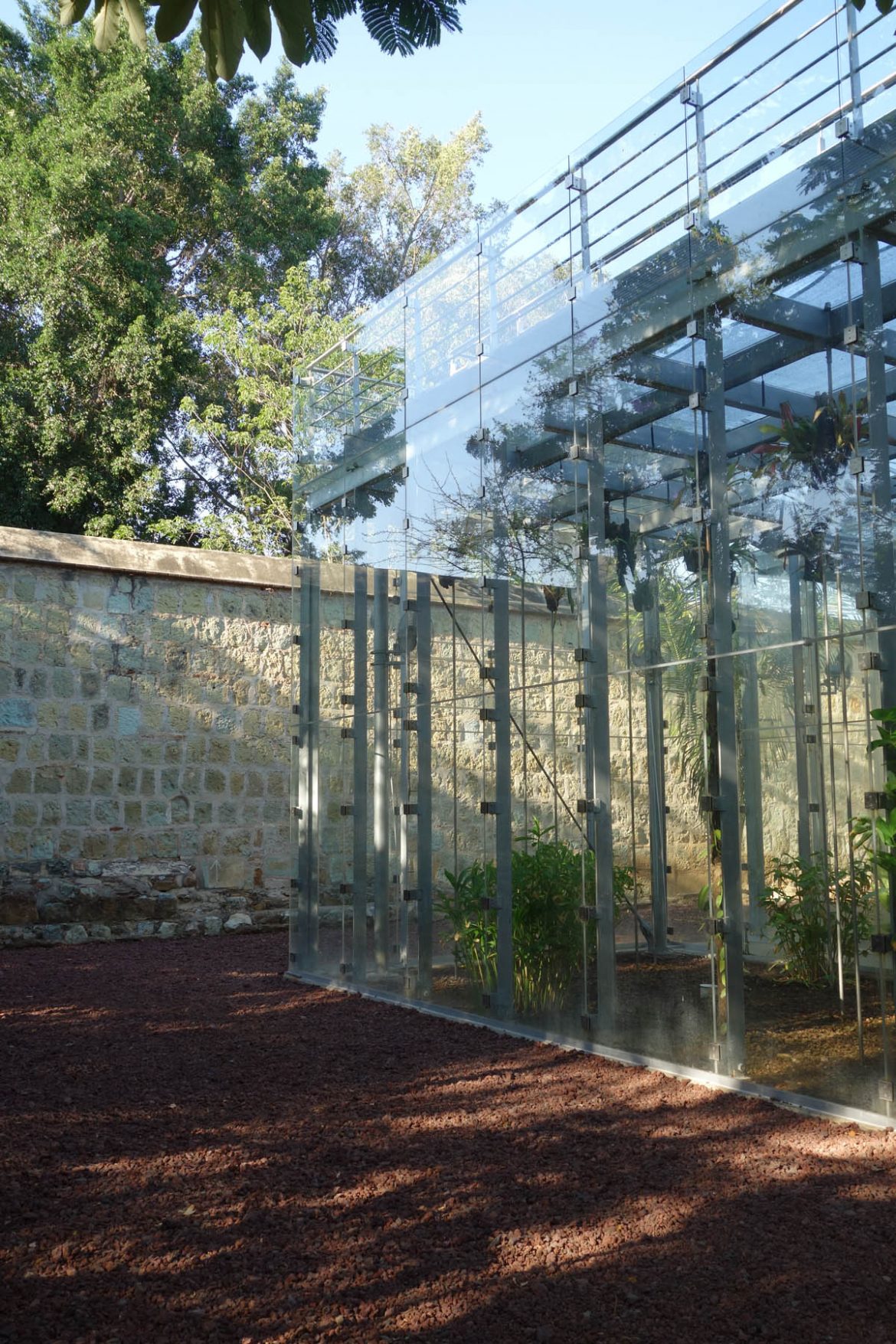 An elegant glass pavilion by Mexican architect Francisco Gonzalez-Pulido (FGP Atelier, Chicago) integrates amazingly well into the historical complex despite its reflective surface. The interplay between glass, metal, the red ground, the green of the plants and the historic sandstone wall is exceptionally harmonious and exciting at the same time. Depending on the light, the pavilion unites with its surroundings or, again, it looks like a shiny cube in the midst of history and nature.